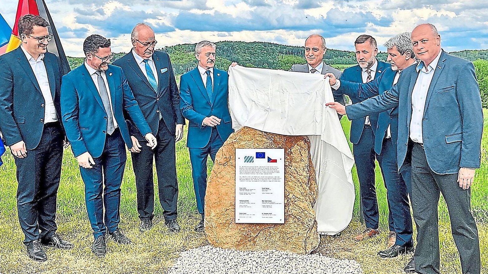 An der Grenze enthüllen hochrangige Vertreter beider Länder einen Gedenkstein zu 20 Jahren EU-Beitritt Tschechiens.