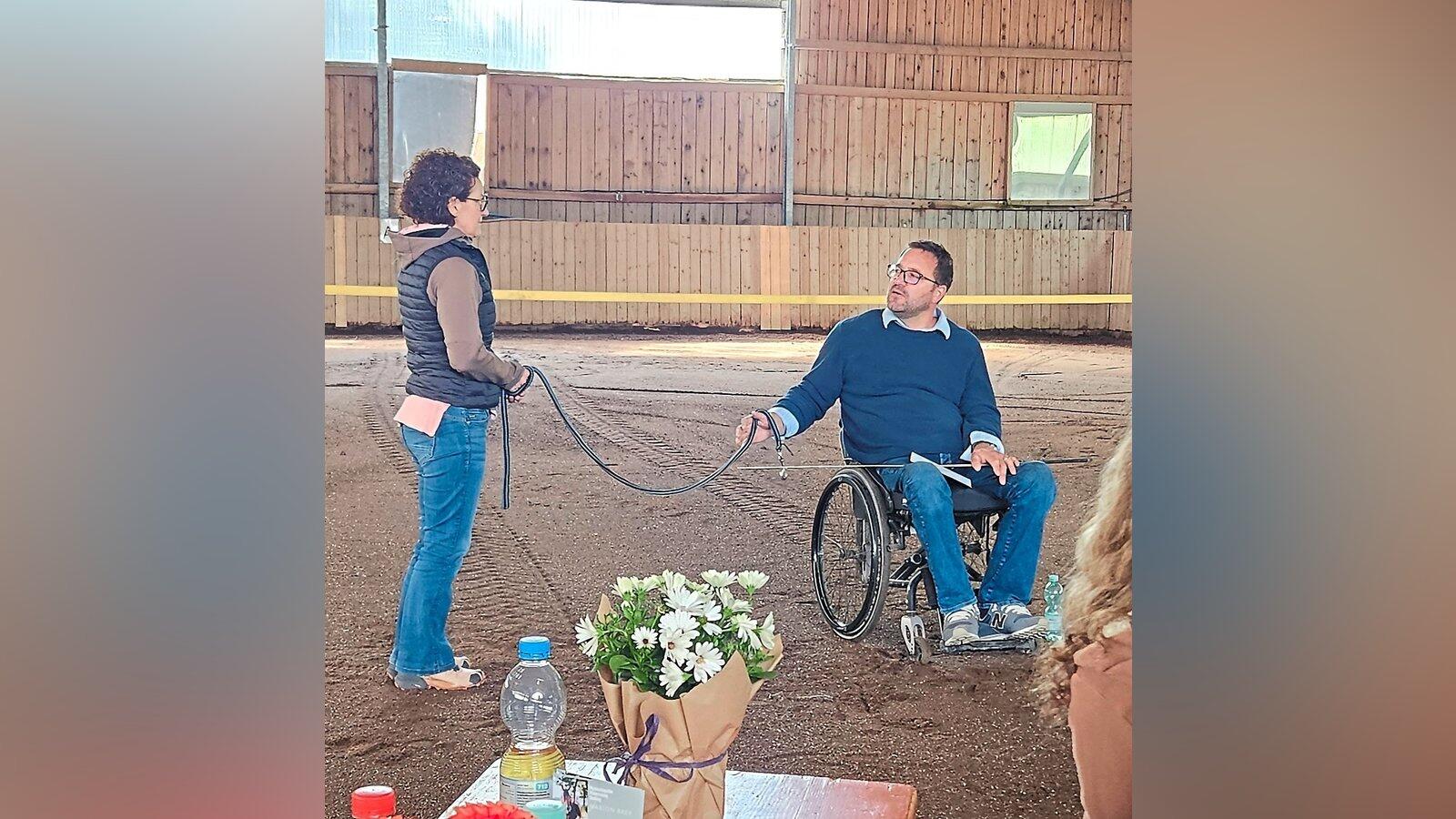 Eine Teilnehmerin fungierte als Pferd. Dabei veranschaulicht der Referent die Theorie zum Pferd am Führstrick bzw. an der Longe.