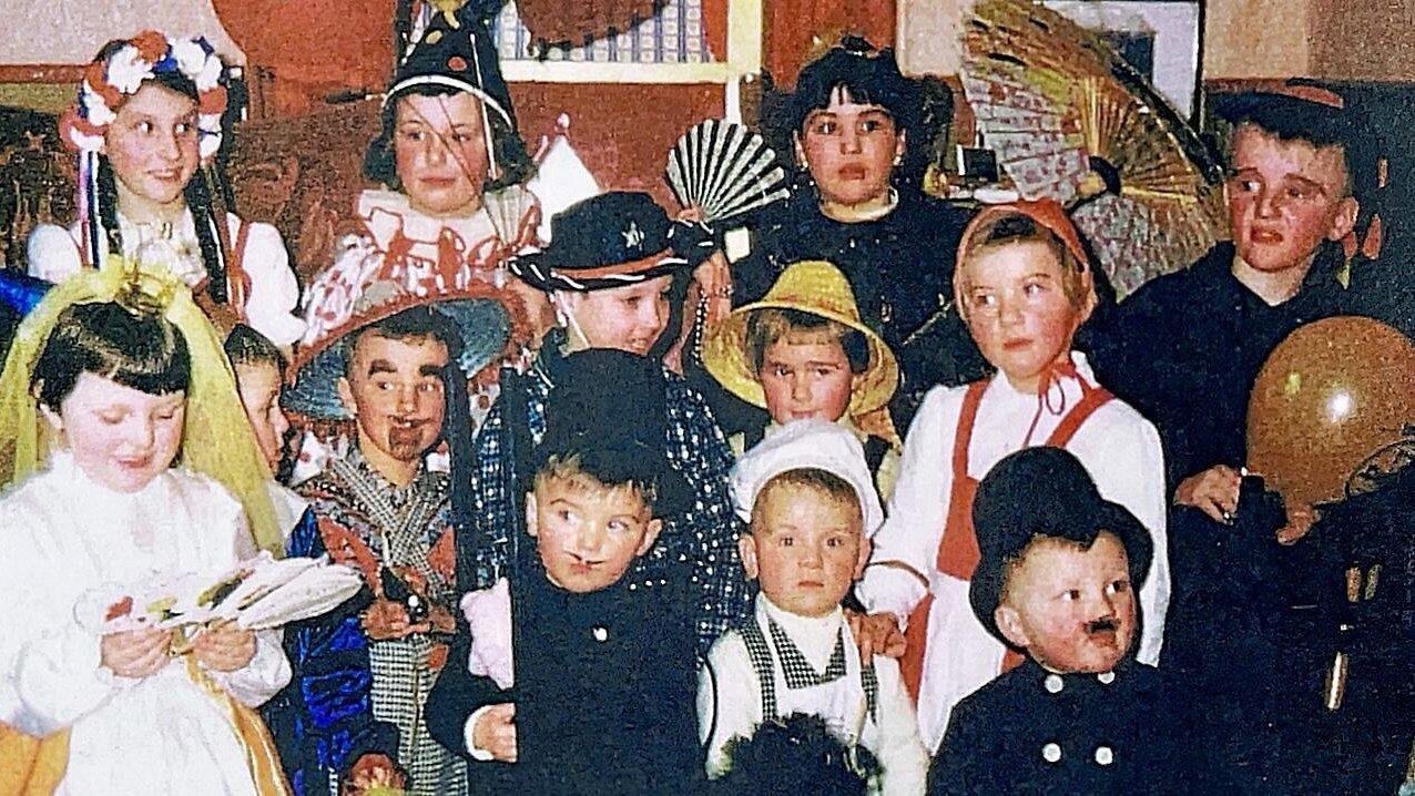 Kinderfasching im Gasthaus "Stangerl" in den 1960er Jahren mit bekannten Gesichtern: Vorne von links: Karin Regner (heute Kraus), Christian und Sebastian Scheuer, Jakob Wolf, dahinter Gerhard Schießl, ein unbekannter Chinese, Edi Schießl, Elisabeth Macht, Gerti Scheuer. Hintere Reihe von links: Johanna und Hubert Perlinger, Karin Schmatz sowie Ferdinand Schmatz.