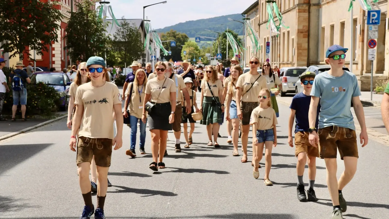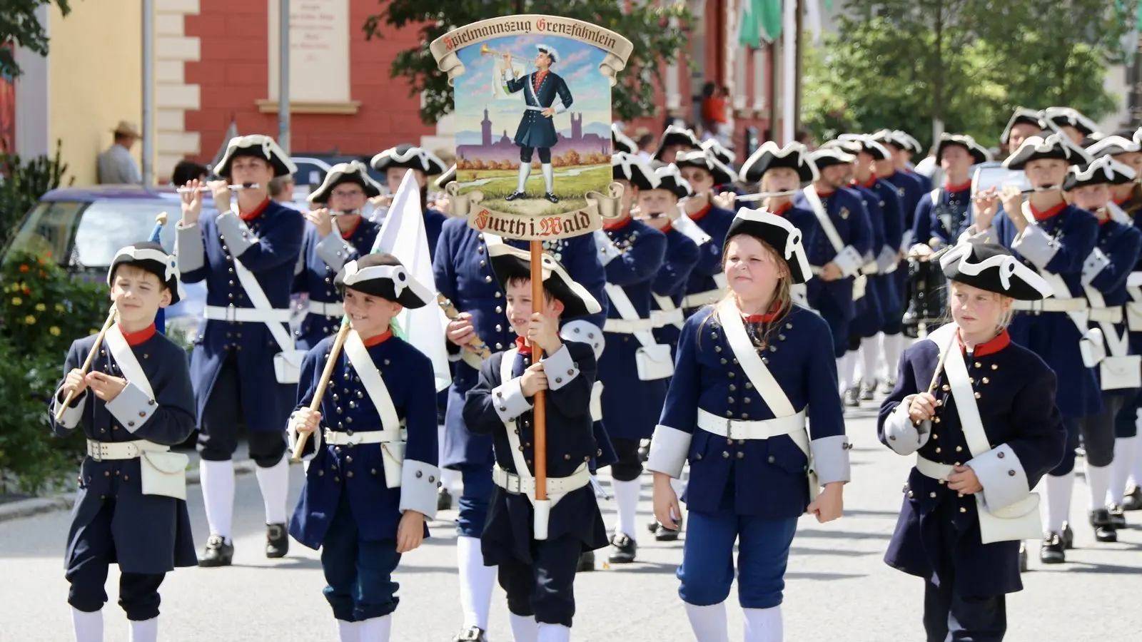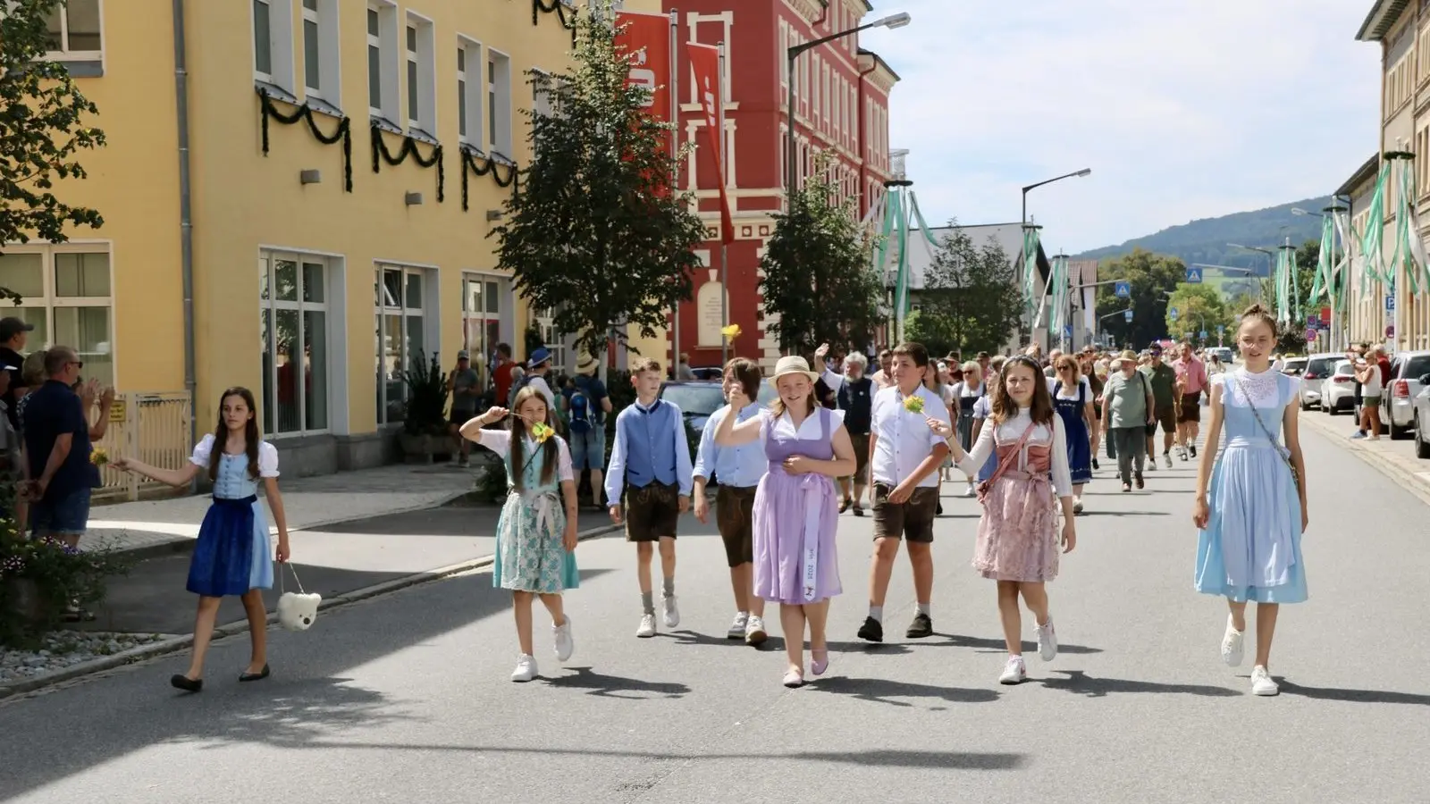 Im Mittelpunkt stand das Ritterpaar Antonia Buschek und Tobias Jelinek, das gemeinsam mit Jubiläumsritter Josef Späth in einer Kutsche fuhr. Angeführt wurden sie von drei Reiterinnen, dem Spielmannszug „Grenzfähnlein“ sowie einer großen Gruppe aus Ritterinnen-Familie und -Freunden. Auch das Kinderritterpaar Margarete Wilnhammer und Christian Baumann war mit von der Partie, begleitet von weiteren Darstellern des Kinderdrachenstichspiels. Es folgten die einzelnen Festspielgruppen - von der prähistorischen Gruppe über die Schranne-Mitglieder und das Volk bis hin zur Kardinalsgarde, den Sattelbognern und den Chamerauern.