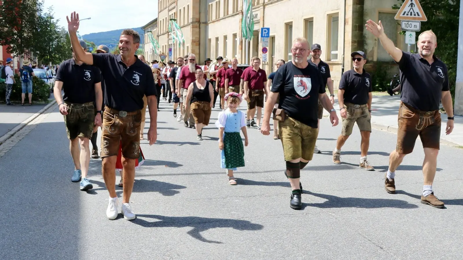 Kurz vor 14 Uhr versammelten sich zahlreiche Akteure zusammen mit dem Blasorchester Furth im Wald und der „Grabitzer Blechblos’n“ an der Ecke Freudensprungsstraße/Bahnhofstraße. Die ehemaligen Ritterpaare trafen sich derweil beim Jubiläumsritter Josef Späth in der Wutzmühle, um den 93-Jährigen, der 1950 den Drachentöter verkörpert hatte, besonders zu ehren. Von dort ging es - angeführt vom Spielmannszug „Grenzfähnlein“ - zum Startpunkt an der Bahnhofstraße. Punkt 14 Uhr setzte sich der Zug in Bewegung. Gesichert von der Stadtfeuerwehr und Vize-Polizeichef Josef Weindl führte die Route über die Bahnhofstraße, den Stadtplatz, die Pfarrstraße, den Bayplatz und die Eschlkamer Straße bis zur Drachenhöhle auf der Festwiese.