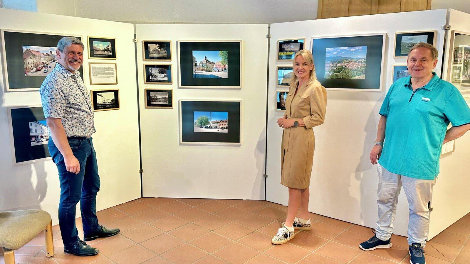 Bürgermeister Sandro Bauer freute sich sichtlich, als er am Donnerstagnachmittag von Kulturamtleiterin Karin Stelzer und Fred Wutz (von links) durch die Ausstellung geführt wurde.