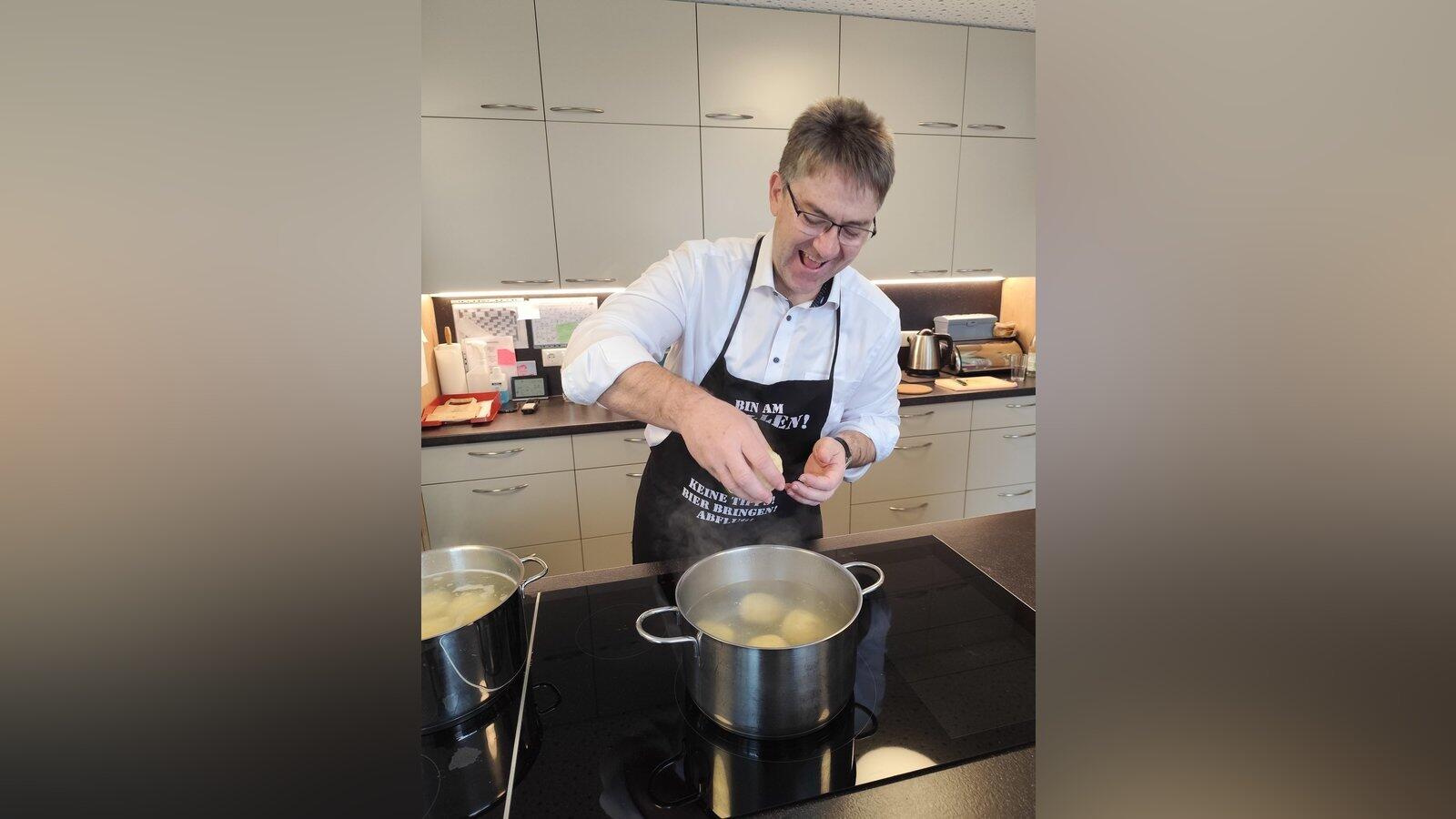 Was man am Weihnachtsmarkt versäumt, lässt sich an Heiligabend nachholen - erst recht mit Kochschürze. Bürgermeister Michael Multerer hielt sein Versprechen und kam nicht nur zu Besuch in die Wohngemeinschaft