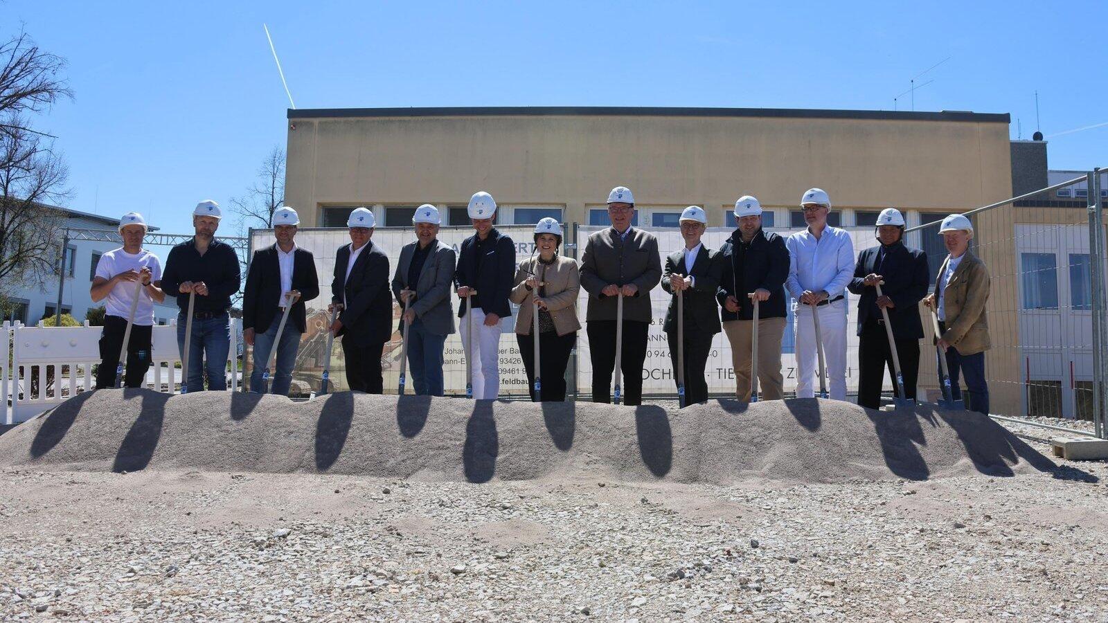 Einige der zahlreichen Ehrengäste aus Politik, Medizin, Wirtschaft und Bankenbranche greifen zum Spaten und setzen somit das symbolische Zeichen für den Beginn eines Projektes, das ein Versprechen an die Menschen der Region sein soll.