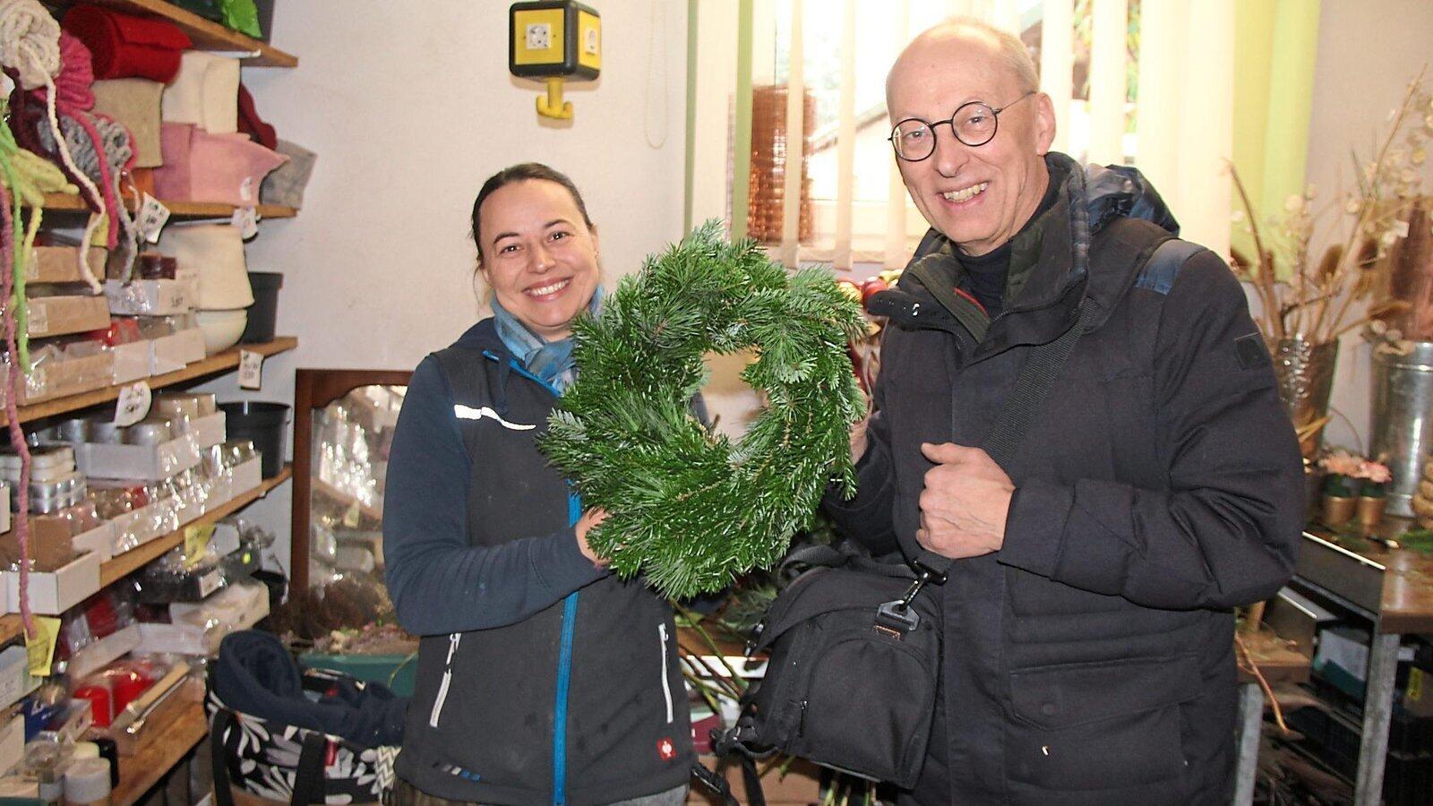 Floristin Martina Beiderbeck und Redakteur Josef Heigl: jeder hält seine Hälfte des gemeinsam gebundenen Adventskranzes.