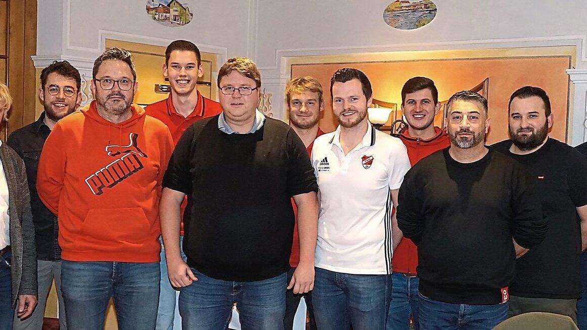 Die neue Fußball-Abteilungsführung des FSV Pösing mit Bürgermeister Michael Reith (links) und Hauptvereinsvorsitzendem Christian Schmitz (rechts).