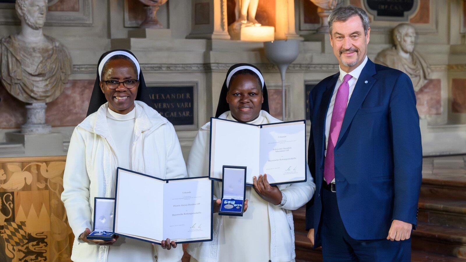 Ministerpräsident Markus Söder überreicht die Rettungsmedaille an die Strahlfelder Schwestern Stembile und Alexia (links).