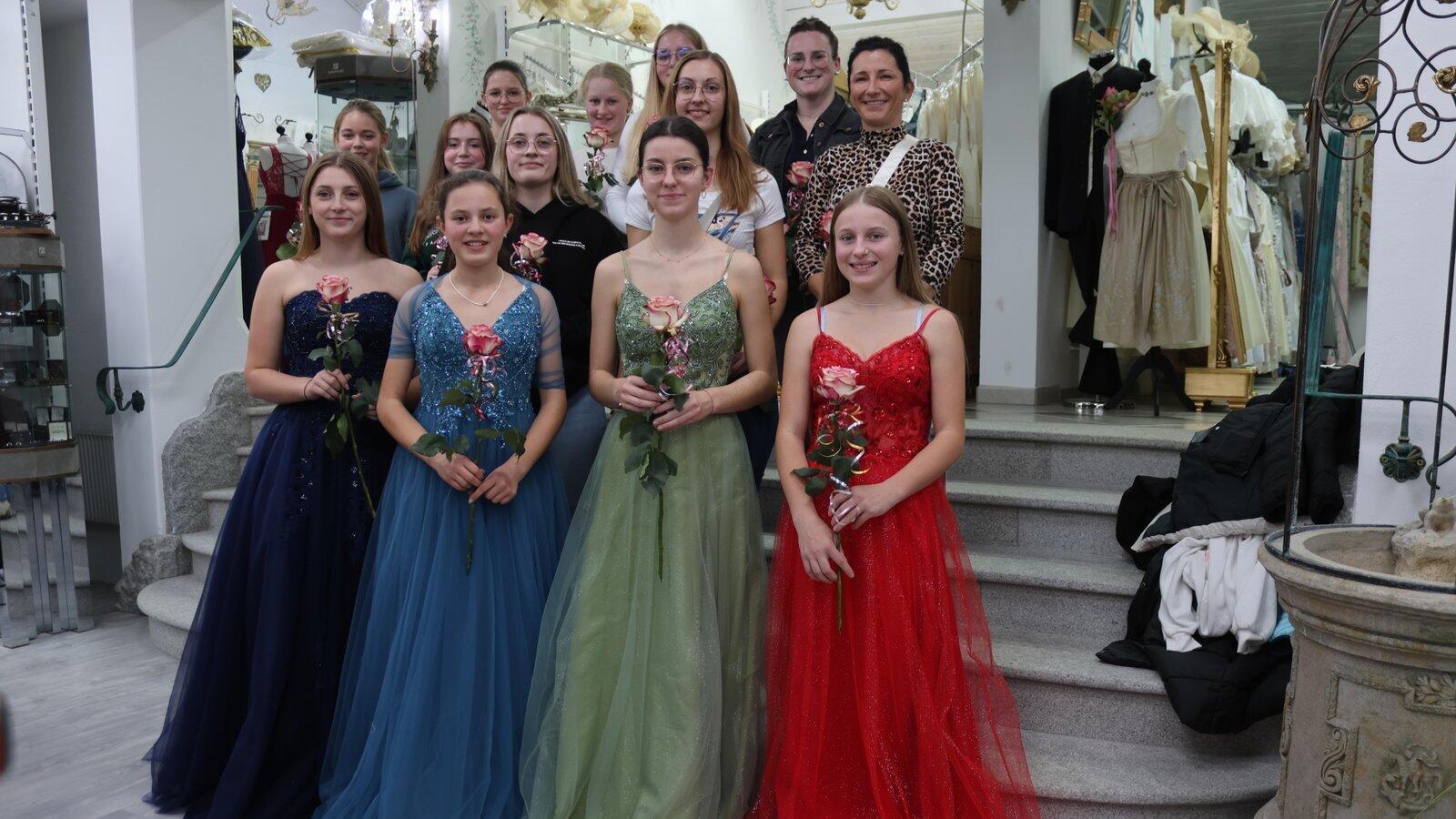 Die Festdamen der Feuerwehr Stachesried mit Festmutter Melanie Schießl, Festbraut Simone Breu und Patenbraut Theresa Adam (hinten von rechts) sind begeistert von der Auswahl an Festkleidern. Welches sie beim Festzug zum 150-jährigen Bestehen am 22. Juni tragen, ist natürlich noch geheim.
