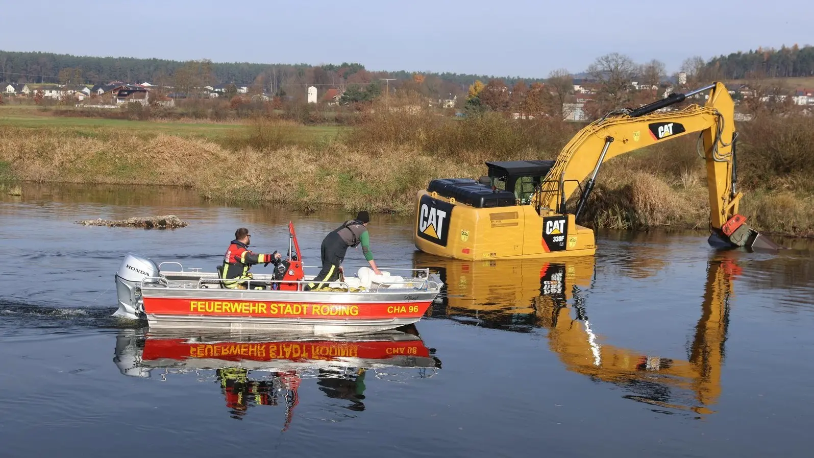 Anschließend setzte mit Hilfe der Arbeiter der Flussmeisterstelle das Rettungsboot der Rodinger Wehr im Regen ein. Die Einsatzkräfte kontrollierten die Umgebung des Baggers auf auslaufende Betriebsstoffe und brachten zur Sicherheit Ölschlängel auf der Wasseroberfläche aus. Um die Bergung des Baggers kümmerte sich anschließend die Flussmeisterstelle selbst.