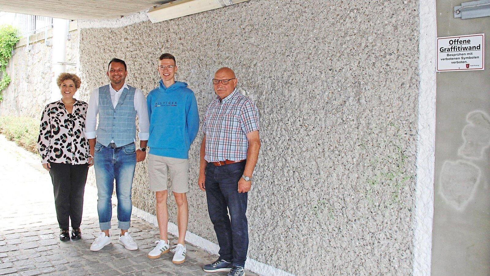 Auf den weiß umrandeten Flächen dürfen Sprayer ihrer Kreativität freien Lauf lassen, ohne Konsequenzen befürchten zu müssen. Dazu laden ein (von links) Bürgermeisterin Alexandra Riedl, Verwaltungsleiter Josef Kaml, David Nagelschmidt vom Jugendrat und Hans Spagl, Leiter des Bauhofs.