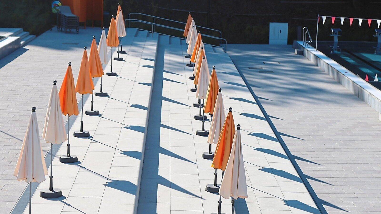 Morgens 7.22 Uhr, keine 14 Grad auf dem Thermometer. Die orange-weißen Sonnenschirme stehen in Reih und Glied am Beckenrand, zugeklappt, wartend auf die ersten Badegäste.