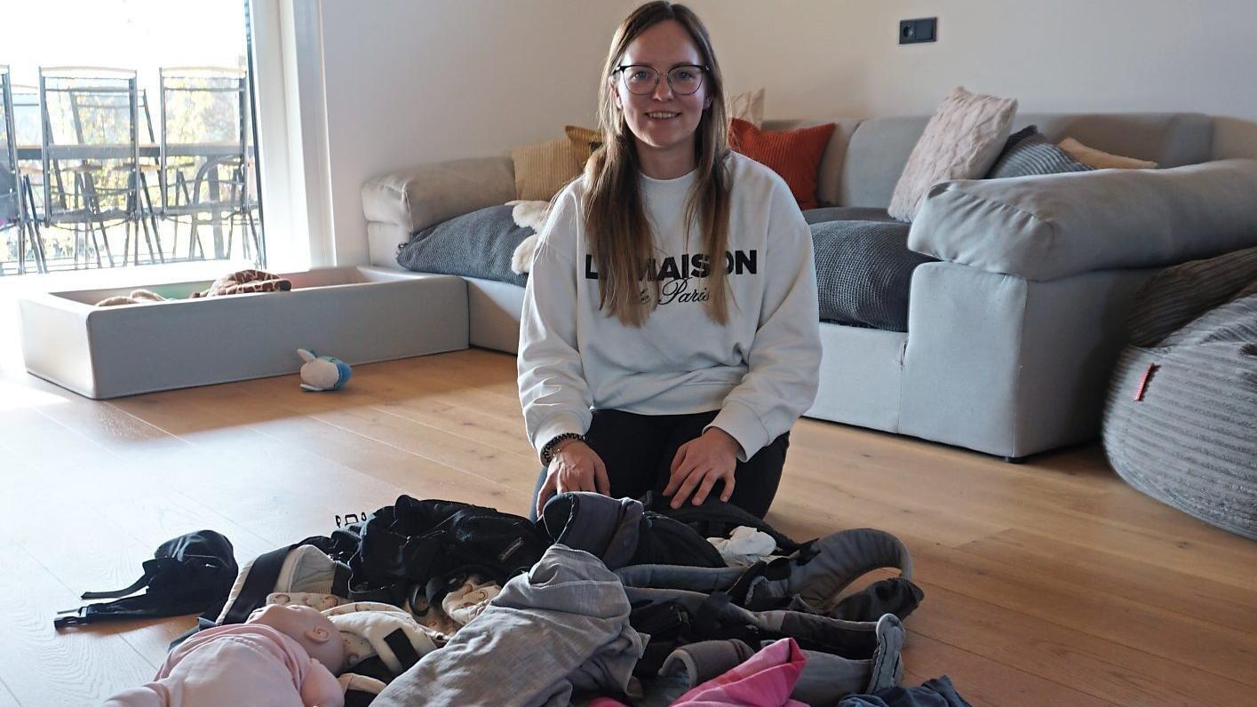 Nadine Reger inmitten einer Auswahl an Tragetüchern und Tragehilfen, die bei ihr in Ruhe getestet werden dürfen.