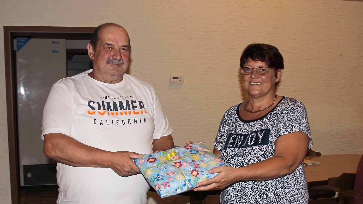 Christine Hirmer überreichte Günter Stöckerl ein Geschenk - als Dank dafür, "was er all die Jahre für die Eisstockabteilung geleistet hat".