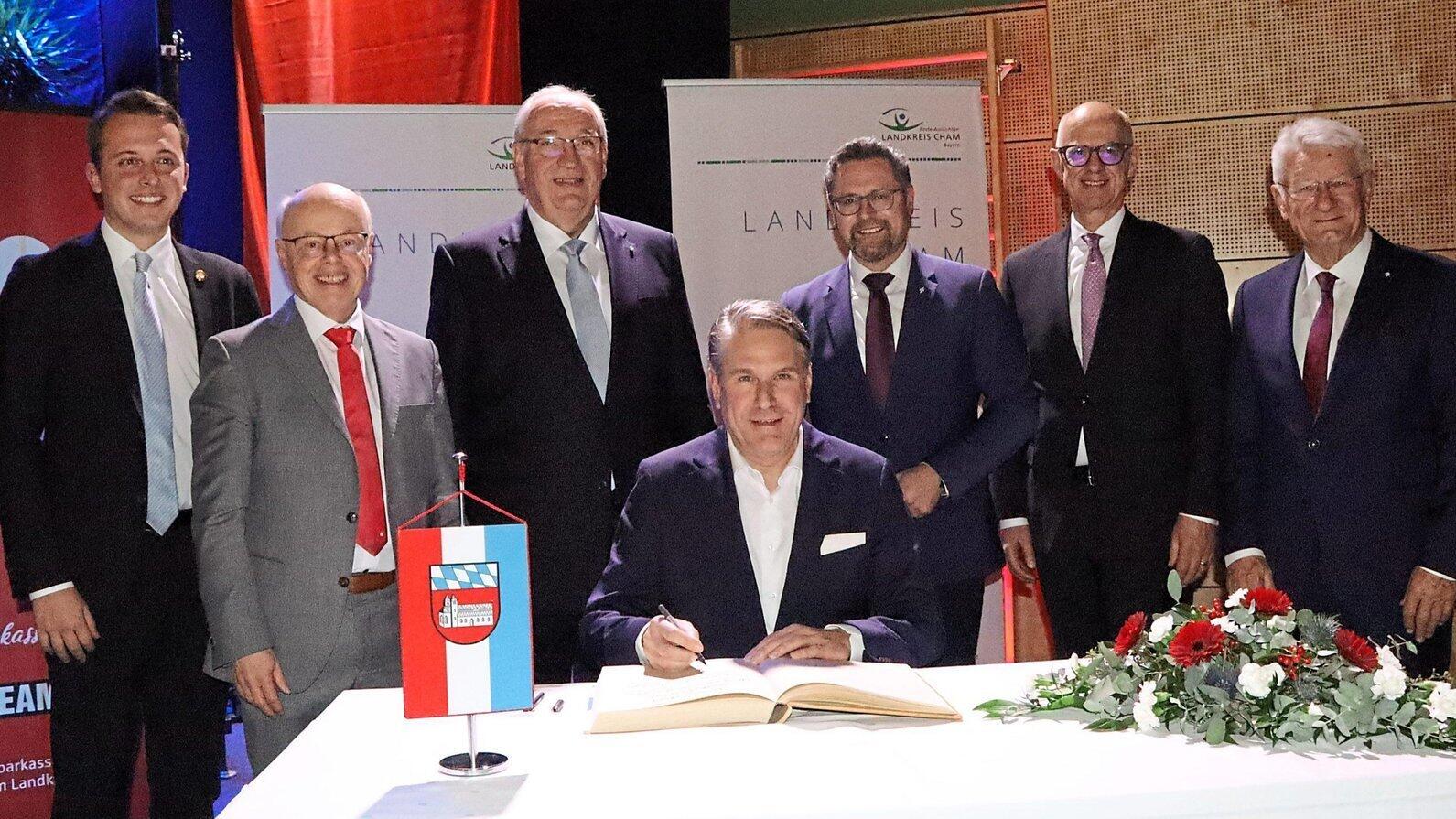 Ganz analog trägt sich Prof. Dr. Christian Stummeyer im Gästebuch des Landkreises ein. Mit im Bild: Julian Preidl, Franz Wittmann, Franz Löffler, Dr. Gerhard Hopp, Walter Jonas und Theo Zellner (von links).