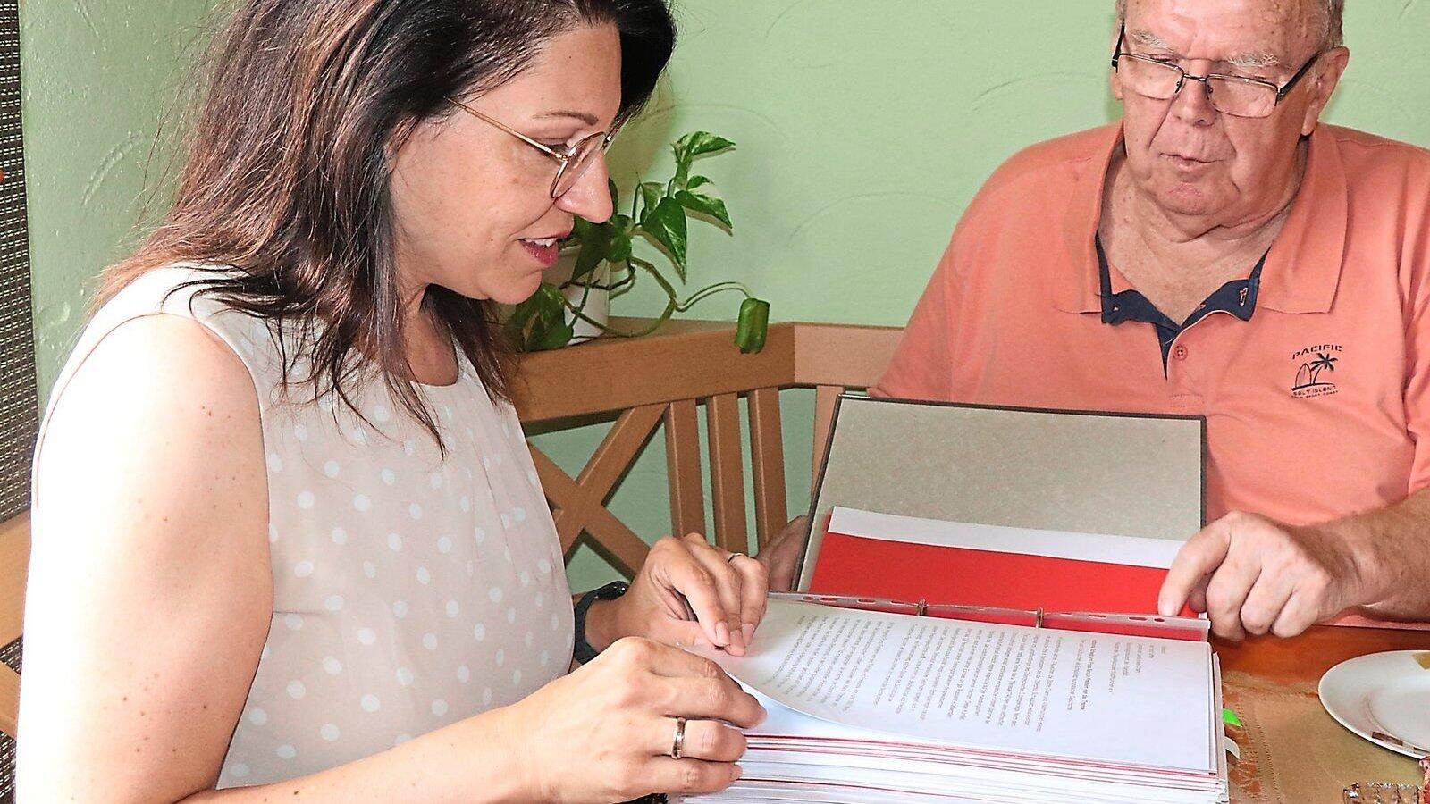 Respekt zollte MdB Martina Englhardt-Kopf Karlheinz Schröpfer beim Durchblättern des Manuskript-Ordners für sein "Kathi"-Buch, das im September erscheinen soll.