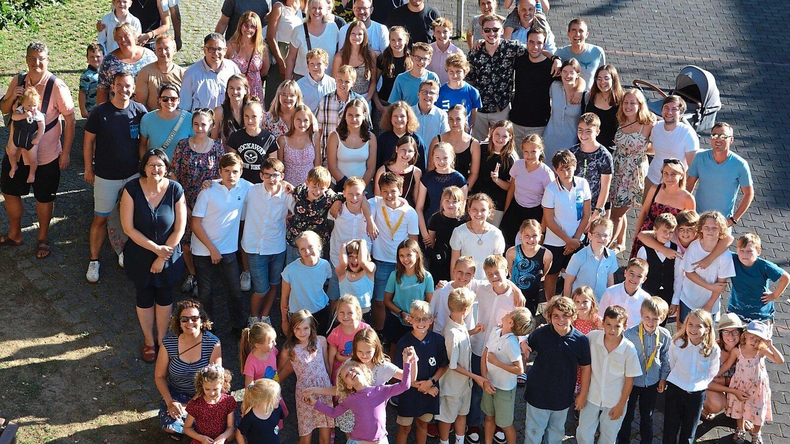Alle Kinder und Jugendlichen, Leiterinnen und Leiter sowie Eltern, Geschwister und Verwandte stellten sich im Hof der Jugendbildungsstätte zum Gruppenfoto.