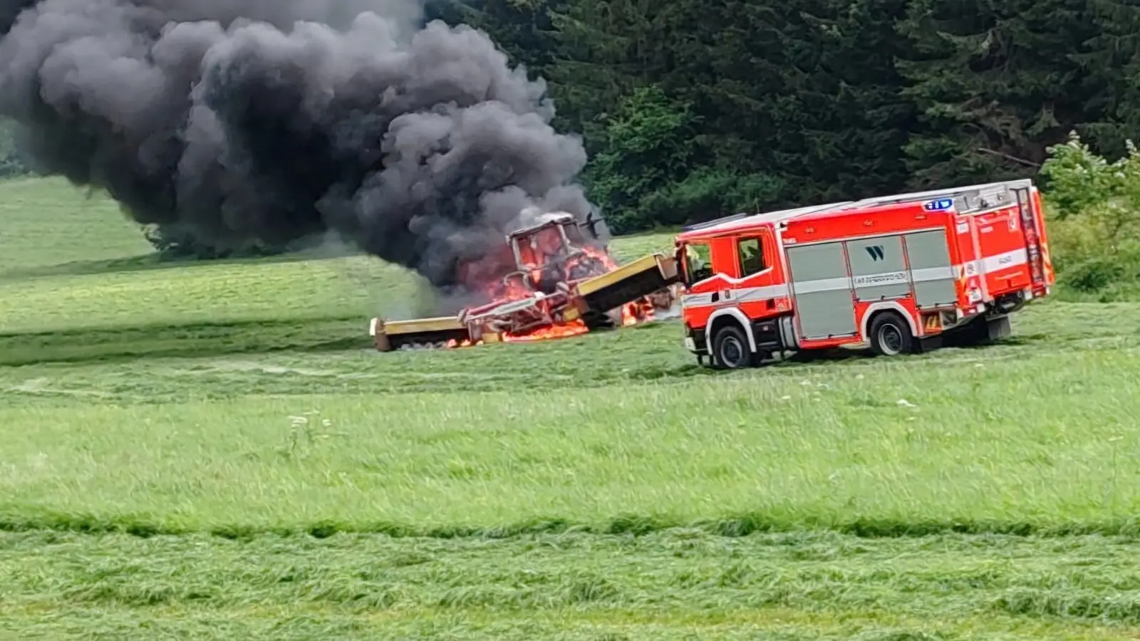 Als die Feuerwehr eintrifft, steht der Traktor mit seinen Mähwerken bereits in Vollbrand. Mehrere Angriffstrupps aus Bayern und Tschechien rückten den Flammen zu Leibe, die da aus dem Gefährt nur kurz hinter der deutschen Grenze loderten.
