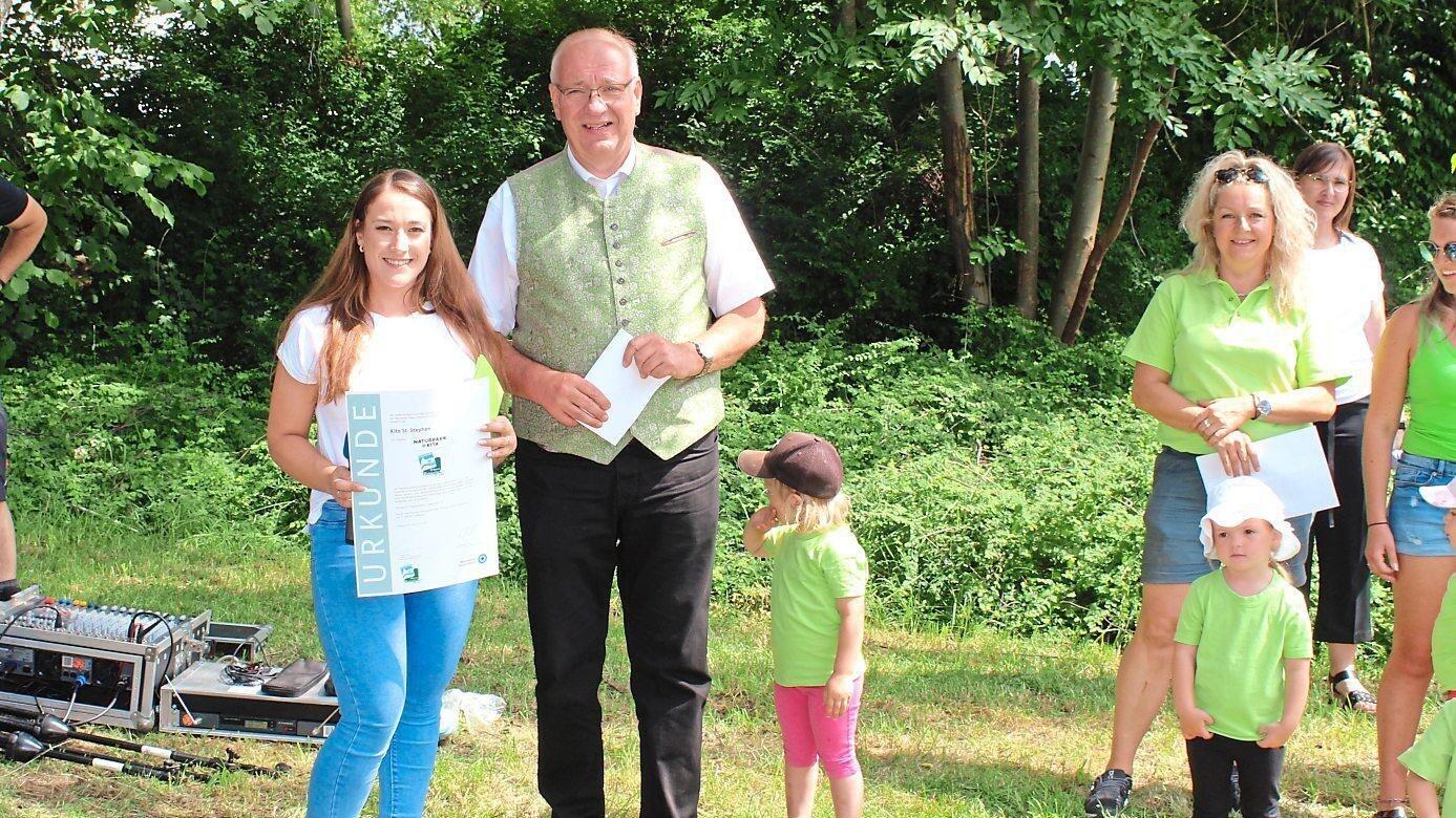 Landrat Franz Löffler überreicht an Leiterin Simone Höcherl die Urkunde "Naturpark-Kita" und gratuliert zur Ernennung.