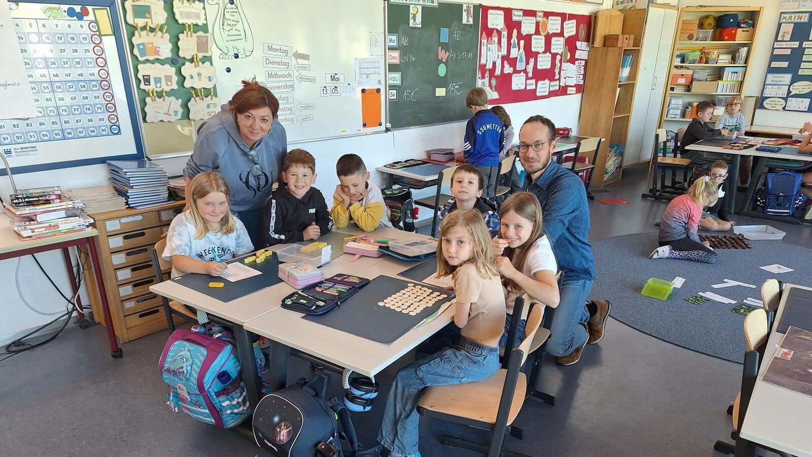 Die ganz Kleinen arbeiten und lernen an den Gruppentischen mit den Größeren, unter den wachsamen Augen von Rektorin Beate Schlichenmaier und Lehrer Korbinian Eder.