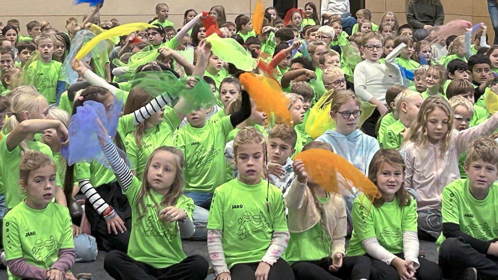 300 Kinderstimmen, ein grünes Meer an Schul-T-Shirts und ein Lied, das längst zum Symbol geworden ist: „Denn jedes Kind ist ganz viel wert“ sangen die Grundschüler ihren Schulsong voller Begeisterung - der perfekte