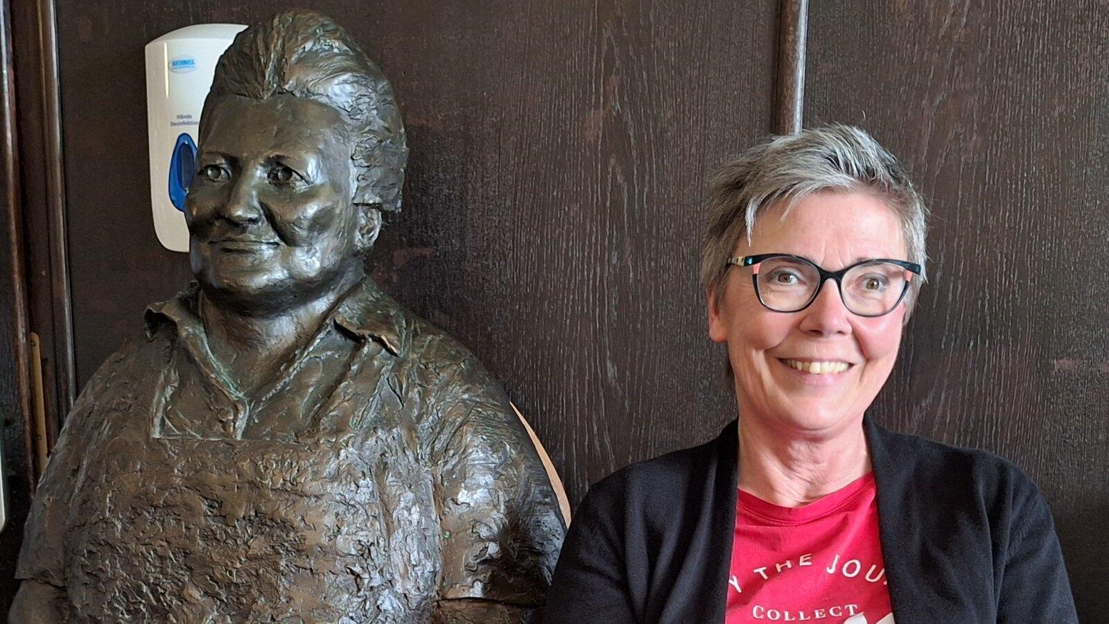 Claudia Denk verabschiedet sich jetzt endgültig von Rosa Bayer, die in Bronze noch immer in der Gaststube wacht.