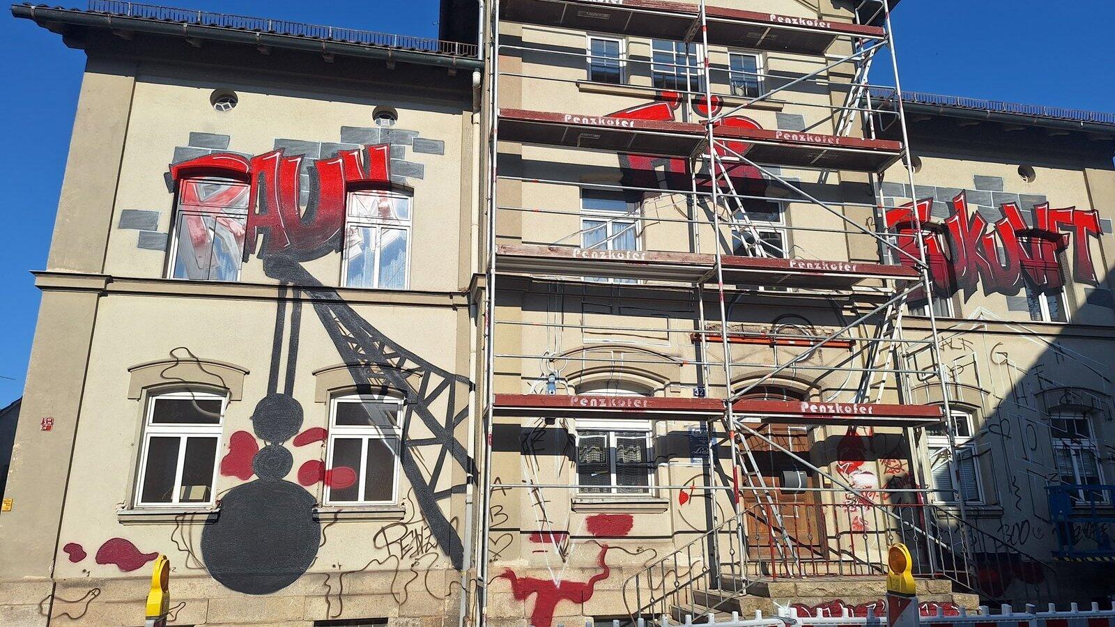 „Raum für Zukunft“ und eine schwarze Abrissbirne sind im Westlichen Stadtgraben zu sehen - so geht Graffiti-Kunst.