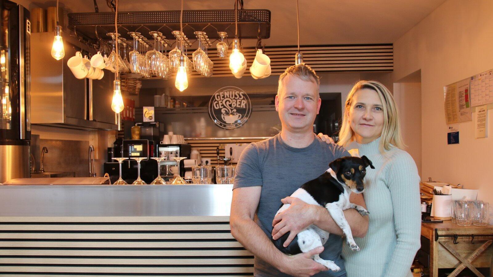 Swetlana und Thomas Gerber, mit Familienhündin Lucy, bieten in ihrem Tagescafé neben Crêpes und Sandwiches auch saisonale Gerichte an.