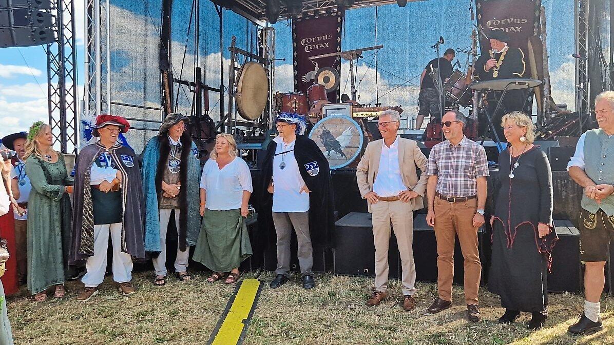 Bürgermeister und Landvogt Jürgen Roith (M.) mit Landrat Bernd Sibler (4.v.r.) und einigen Puchberger Rittern als einstigen Burgherren.