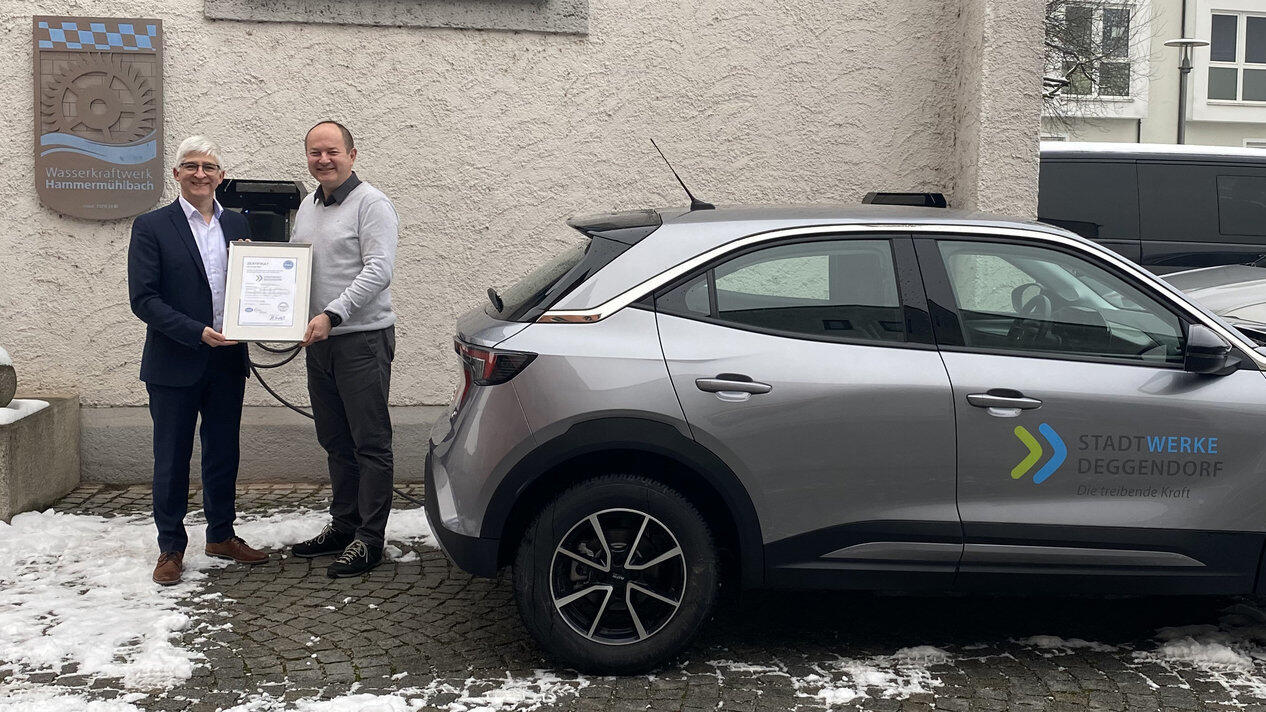 Stadtwerke-Geschäftsführer Alexander Springer (l.) präsentiert gemeinsam mit dem Technischen Leiter und Leiter des Energieteams, Gerhard Kuchler (r.), das Zertifikat neben dem jüngst angeschafften Elektroauto.