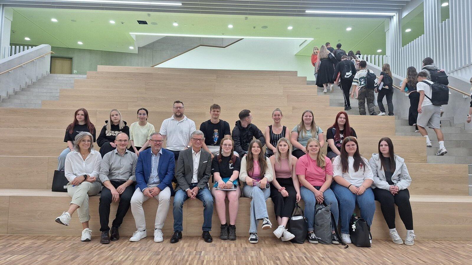 Diese Jugendlichen zogen als Erste in das neue Schulhaus ein. Sie wurden vom Landrat, den Abteilungsleitern der Bauabteilung und Schulleiter Christian Alt begrüßt.