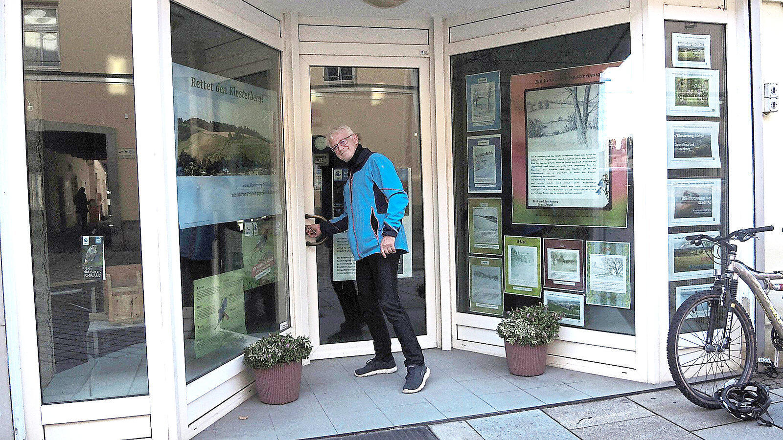 Kurt Schürzinger von der Gruppe „LokalGlobal“ vor der Tür des neuen Ladens „Hier und Jetzt“ an der Pfleggasse 15. Er soll ein Zentrum für Kunst, Kultur und Kommunikation werden.