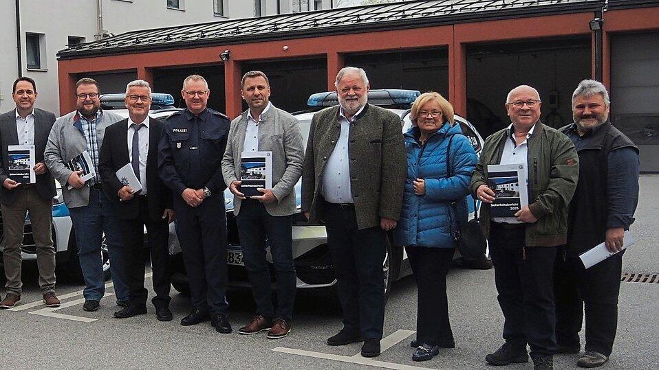 Die Kriminalstatistik der PI Deggendorf für 2025 zeigt eine rückläufige Zahl an Delikten. Polizeidirektor Markus Völkl (6.v.r.) und seine Kollegen mit den Bürgermeistern und Vertretern der 16 Gemeinden.