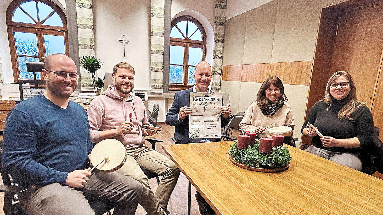 Ton und Tannenduft: (v.l.) Benjamin Alber (Referent des OHO-Stadtmarketings), Oliver Gotzler (Leiter der Musikschule ILE Donauschleife), Bürgermeister Thomas Etschmann, Andrea Schöttl und Julia Rehm vom Förderverein der Musikschule.