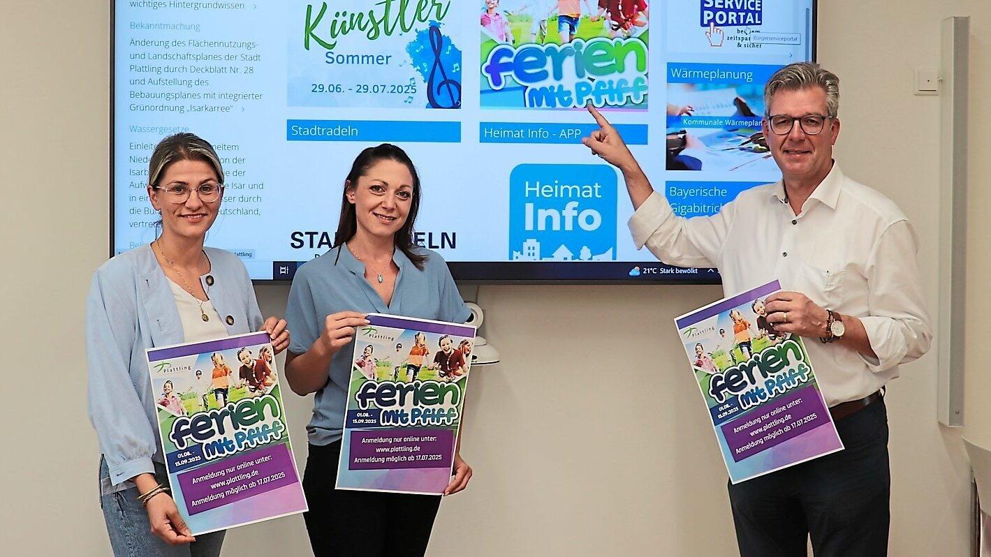 Bürgermeister Hans Schmalhofer (v.r.), Manuela Weiß, vom Plattlinger Kulturamt und dessen Leiterin, Kathrin Tost, stellen das diesjährige Programm der „Ferien mit Pfiff“ vor.