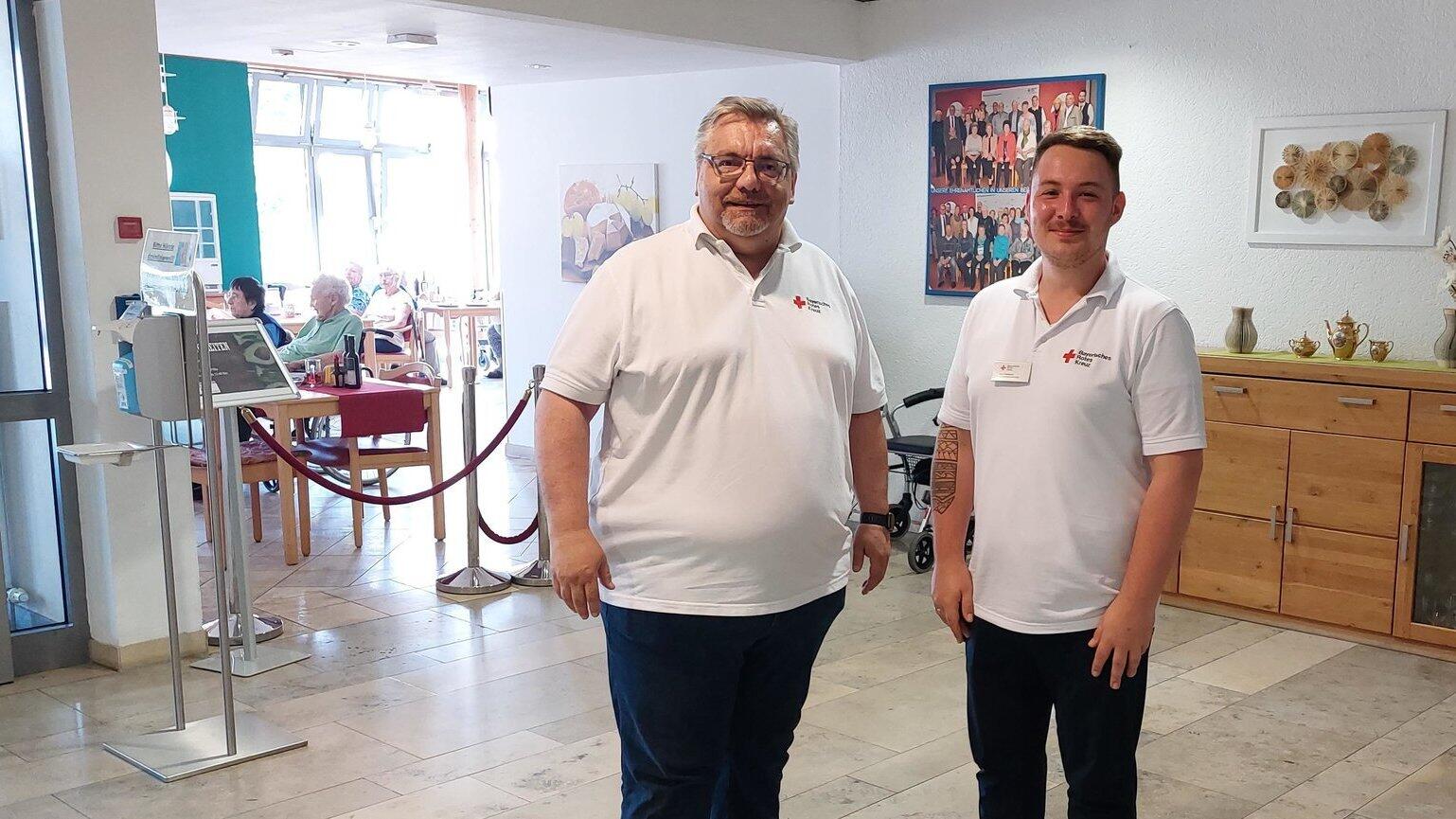 BRK-Kreisgeschäftsführer Gerhard Gansl und Heimleiter Kai Pielmeier im Eingangsbereich vor der Cafeteria, die gut besucht ist.