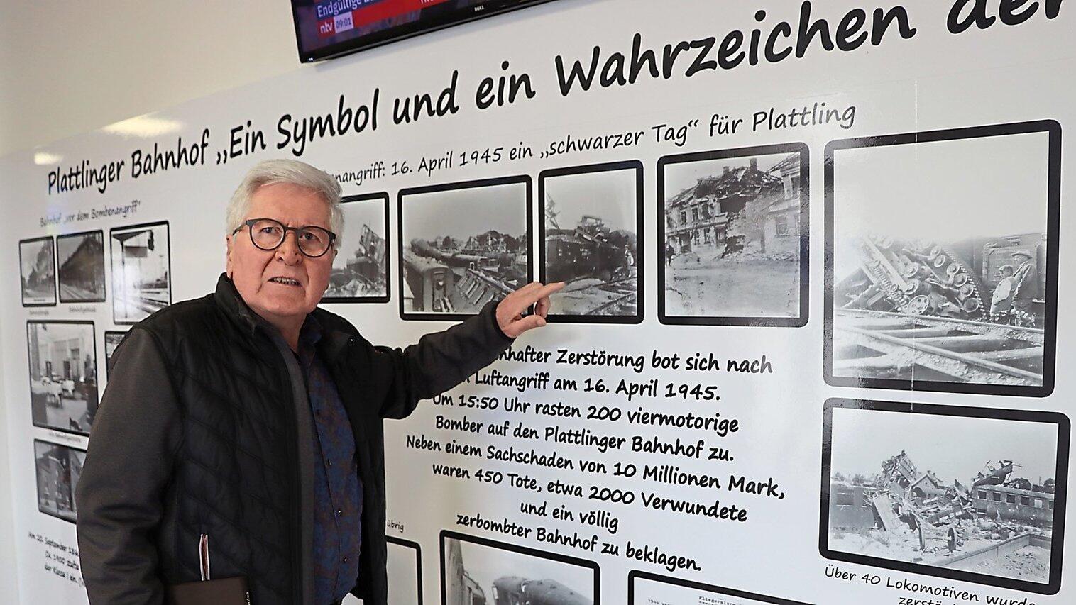 Was alle Schüler lernen sollten: Reinhard Mattioni in der Bahnhofshalle vor der Hinweistafel auf den verheerenden Bombenangriff am 16. April 1945.