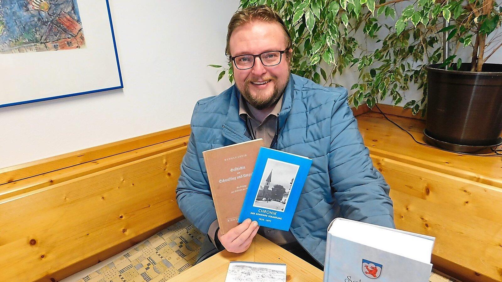 Unter dem Titel "Schauflinger Heimatgeschichte" wurden die früheren Gemeindechroniken von Rudolf Janik (1935) und Hans Stangl (1971) zusammengefasst. Der Schauflinger Bürgermeister Robert Bauer hält bei der Vorstellung der Neufassung die alten Originale in der Hand. Rechts daneben das 2019 erschienene umfangreiche "Buch zur Heimatgeschichte" Schauflings.