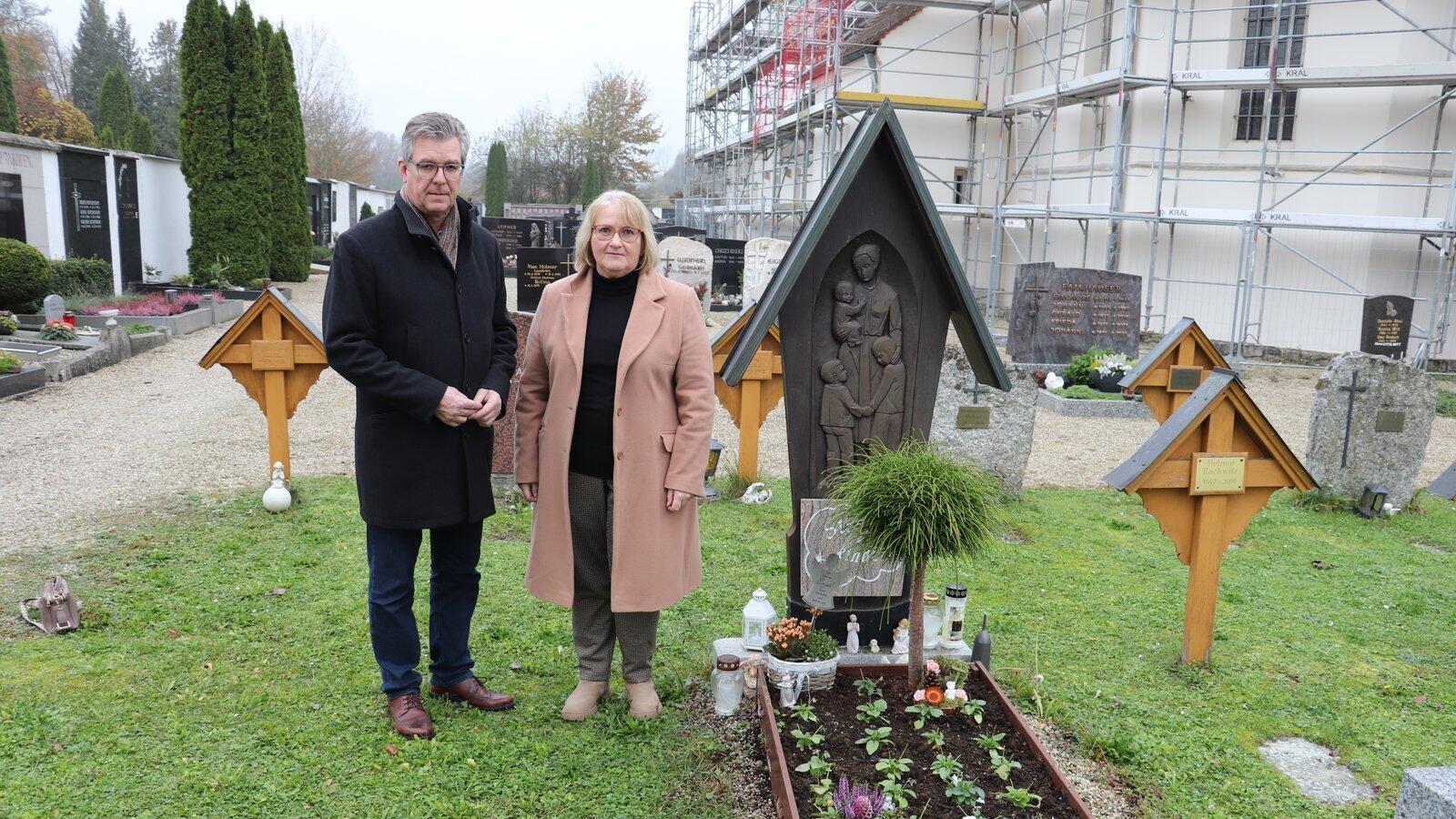 Bürgermeister Hans Schmalhofer und Friedhofsverwalterin Monika Beham neben dem Sternenkindergrab am Plattlinger Friedhof.