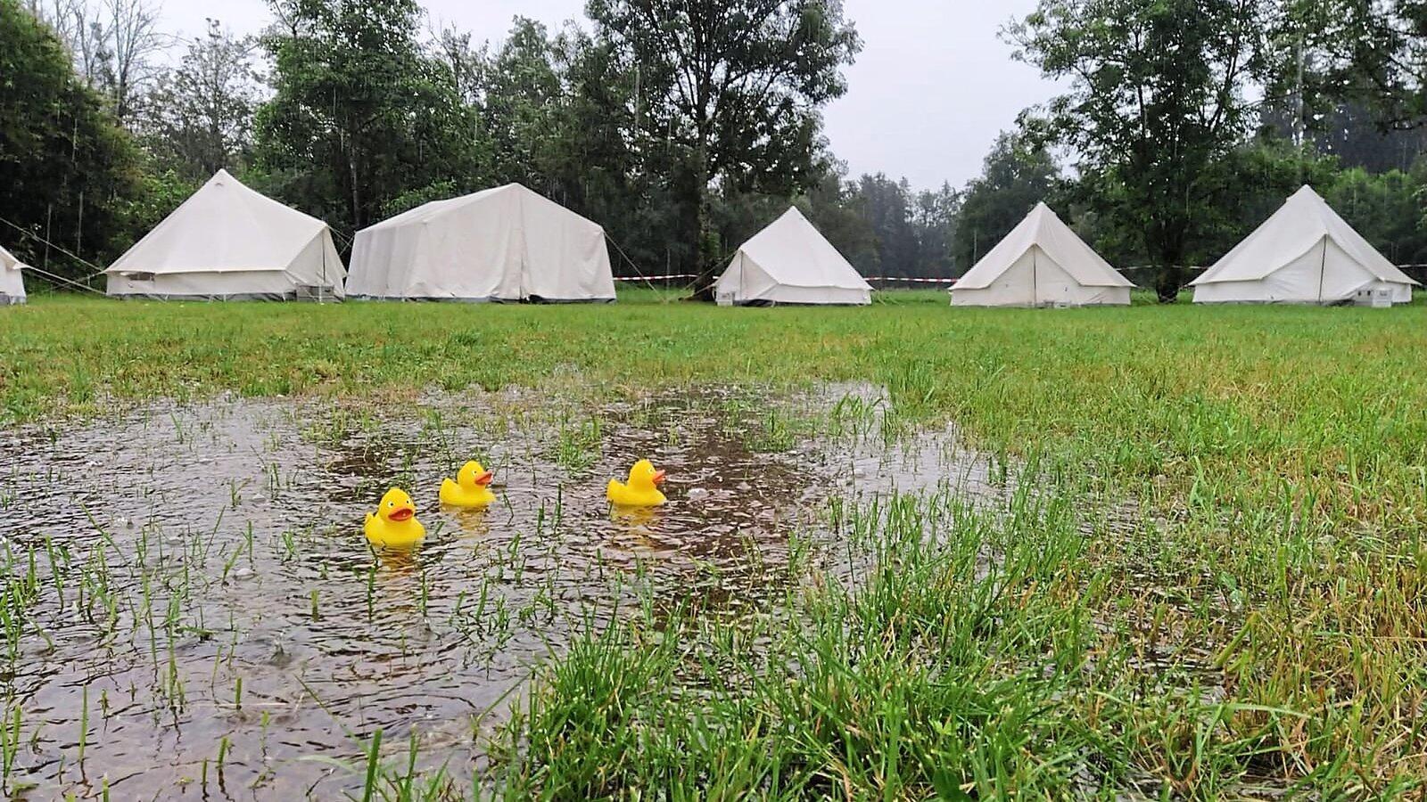 Die KJR-Verantwortlichen ließen die Kinder und Jugendlichen heuer nicht im Regen stehen, auch wenn dieses Bild vom Zeltlager den Eindruck vermitteln könnte. Die Diözese Passau hatte eigens für den KJR Deggendorf den Zeltplatz geöffnet und auch Personal zur Verfügung gestellt.