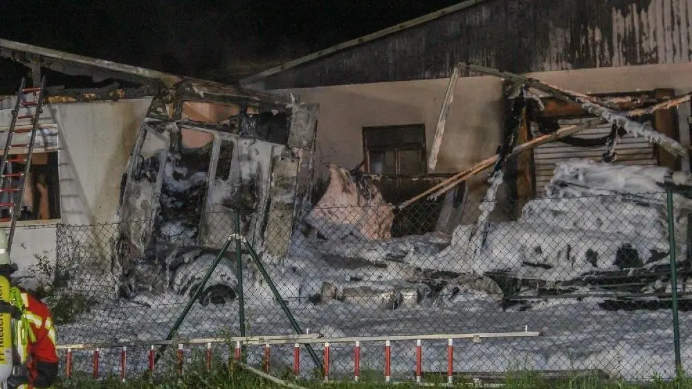 Lastwagen durchbricht Firmentor und geht in Flammen auf