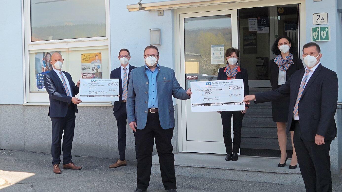 Spendenübergabe zum Abschied mit (v. l.) Raiffeisen-Vorstandsvorsitzendem Johann Freund, Tobias Dengler, Bürgermeister Robert Bauer, Christa Scheungraber, Annemarie Merz und Christian Hofbauer.