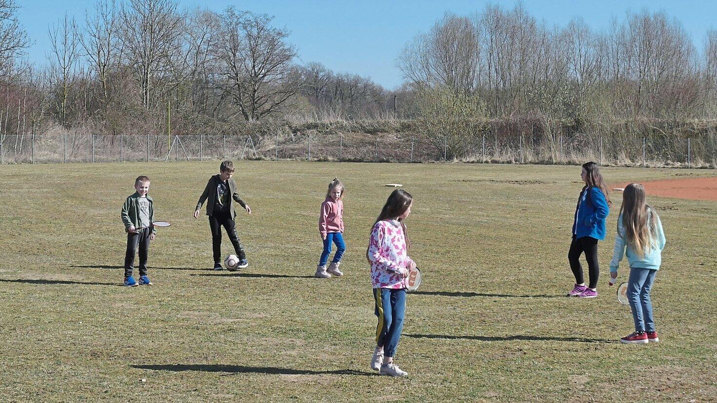 Unbeschwerte Momente beim Spielen am Sportplatz neben der provisorischen Unterkunft erleben zumindest die ukrainischen Kinder.