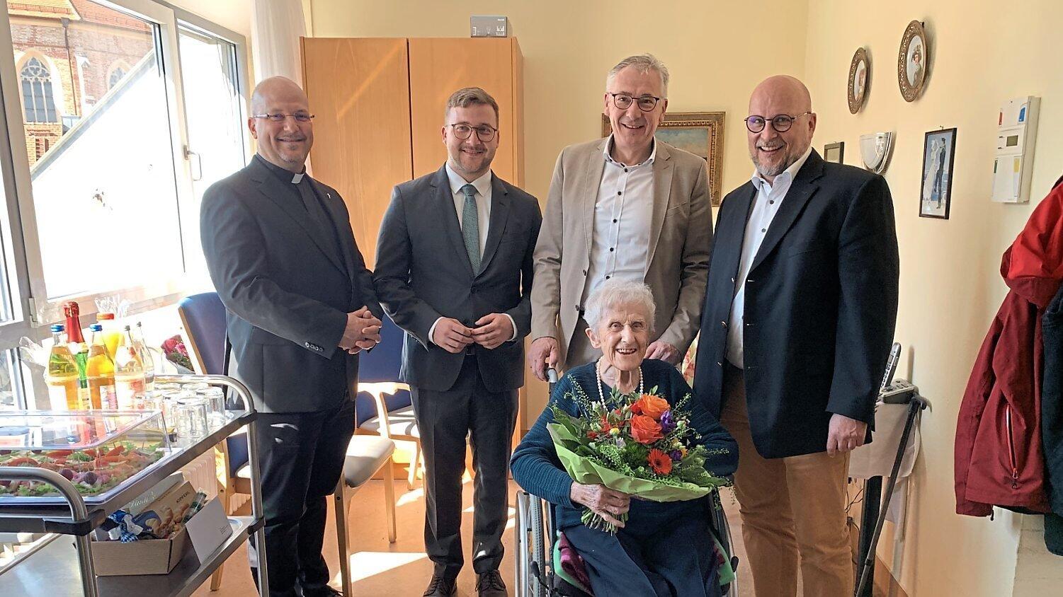 Zu ihrem Jubiläum wurde Anna Bayerlacher von den Oberhäuptern des Münsters, der Stadt und des Landkreises in ihrem Zimmer im Bürgerheim beschenkt.