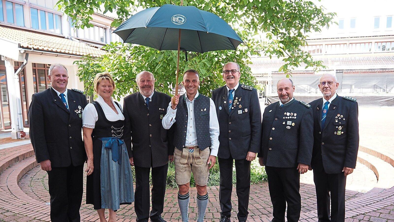Bürgermeister Armin Grassinger übernimmt die Schirmherrschaft für das Doppeljubiläum. Vertreter aus dem Schützengau baten darum: Thomas Klugbauer, Heidelinde Ruhland, Franz Schicker, Gauschützenmeister Rainer Mücke, sein Stellvertreter Helmut Rosenfeld und Ehrengauschützenmeister Michael Ruhland.