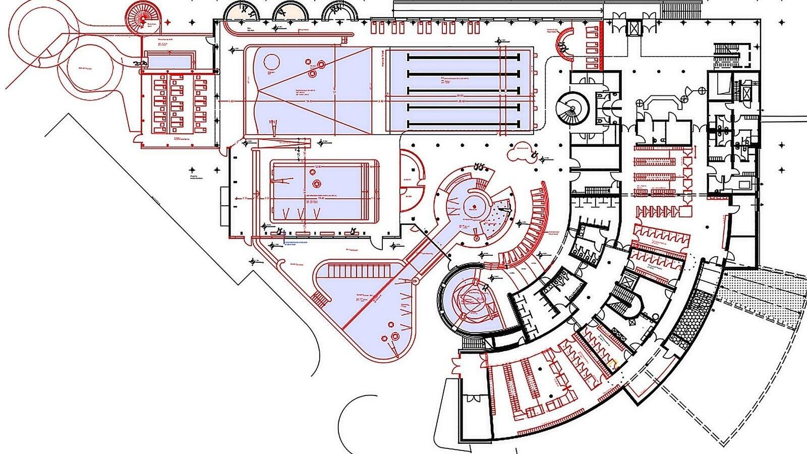 Die Planungen für den großen Umbau des Caprima-Hallenbereichs: Links oben eine 70 Meter lange Rutsche und ein Wintergartenbereich mit fest installierten Liegen, daneben das Wellenbecken und das Schwimmerbecken mit schwarzen Linien. Im unteren Bereich ein Lernschwimmbecken, Heißwasserbecken mit Verbindung in den Außenbereich sowie die Grotte.
