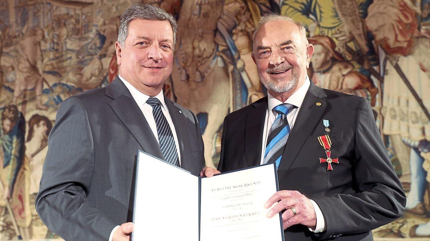 Staatsminister Christian Bernreiter überreichte Michael Rieger mit dem Bundesverdienstkreuz am Bande eine von Bundespräsident Dr. Frank-Walter Steinmeier unterzeichnete Urkunde.