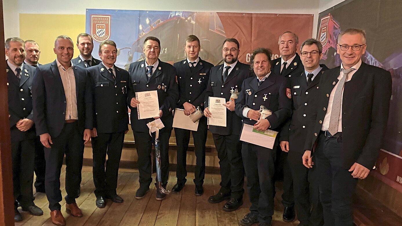 Die Vorstandschaft der Feuerwehr sowie Bürgermeister Armin Grassinger, Kreisbrandrat Josef Kramhöller und Landrat Werner Bumeder mit einem Teil der geehrten Mitglieder.