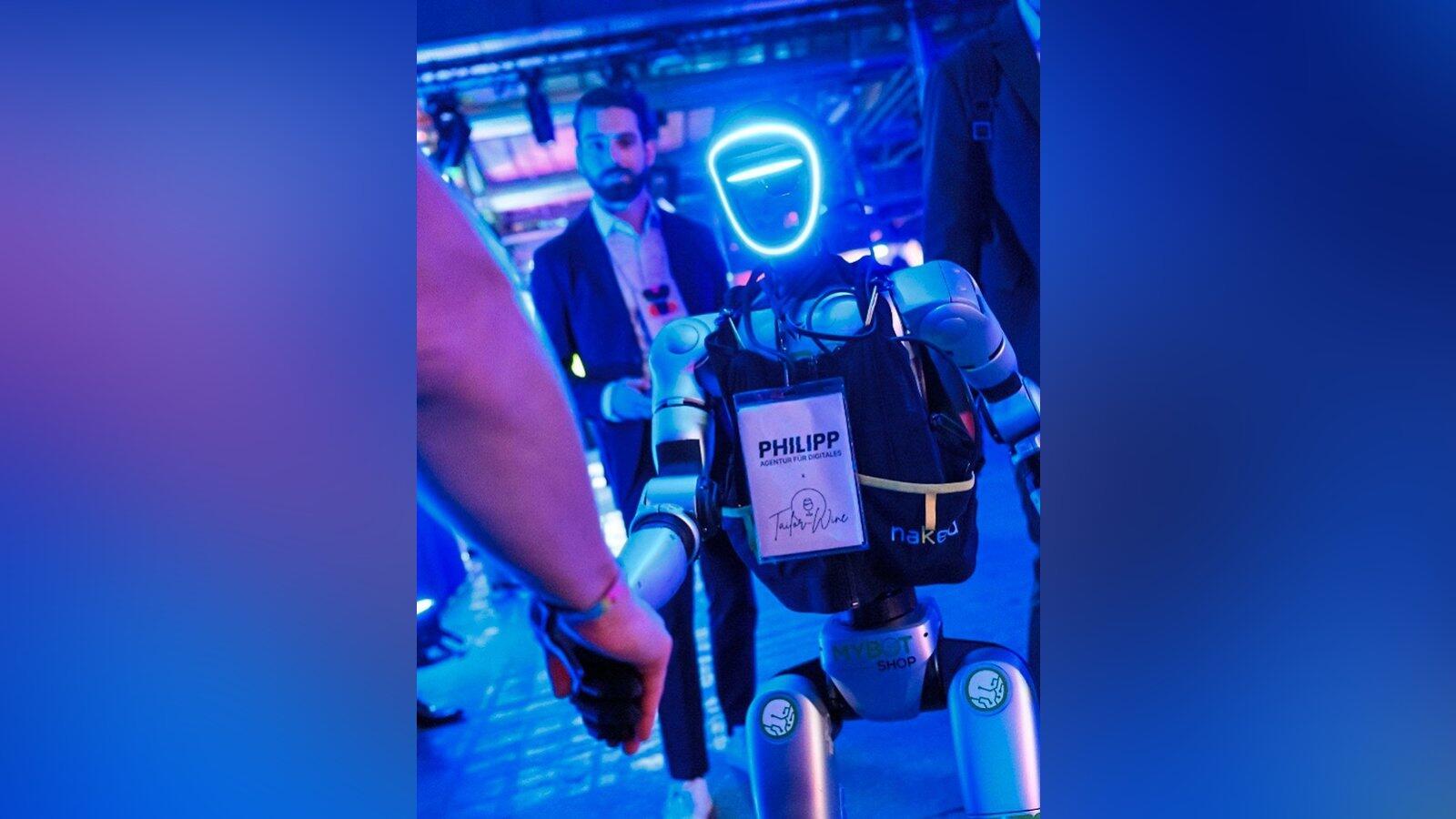 Auf der diesjährigen Konferenz re:publica in Berlin war Philipp Mann (im Hintergrund) mit einem vollfunktionsfähigen Roboter, der sprechen kann.