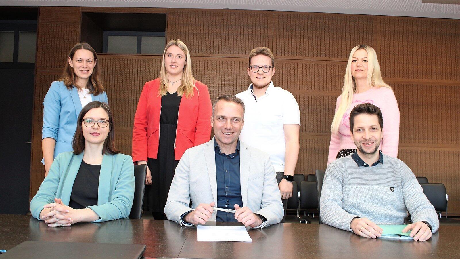 Informieren über die neuesten Zahlen rund um Dingolfing: Amtsleiterin Judith Forster, Bürgermeister Armin Grassinger, Pressesprecher Johannes Schnabl (vorne, v.l.) sowie die Standesbeamten der Stadt Dingolfing (hinten, v.l.) Christine Beisl, Marina Schmerbeck, Lukas Trübenbach und Janina Blenn.