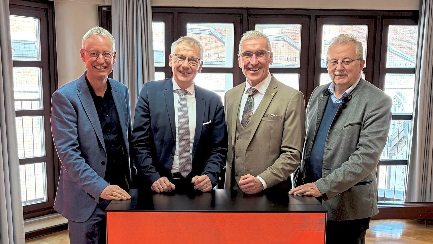 Die Verwaltungsratsvorsitzenden Oberbürgermeister Markus Pannermayr, Landrat Werner Bumeder und Landrat Josef Laumer gratulierten dem Vorstandsvorsitzenden Walter Strohmaier zum Jubiläum.